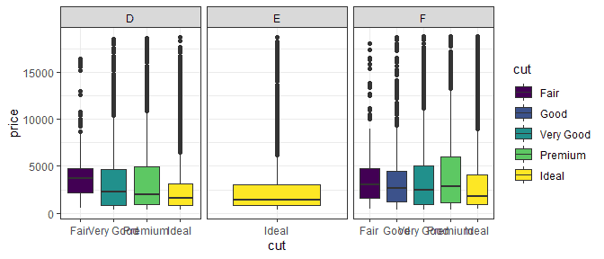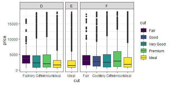 我们手动挑选各个 color 中的个别 cut 数据出来。使用 facet_grid 进行分面。
